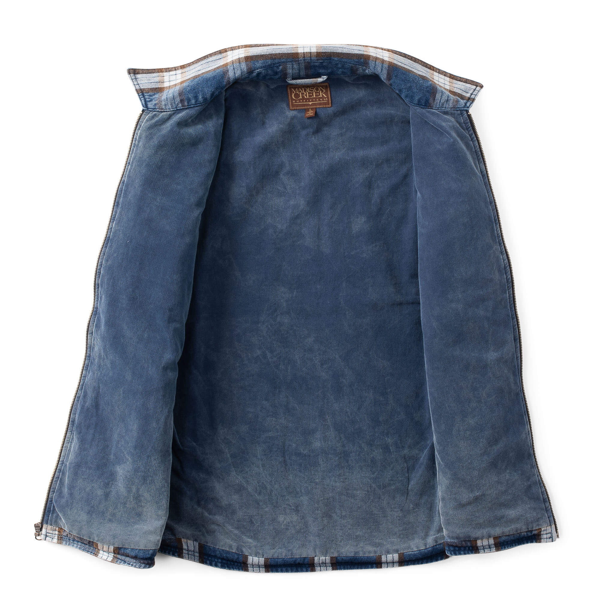 The Dalton Shirt Jacket offers the casual look of a plaid shirt with the added warmth and function of a lightweight jacket. Designed for layering, it features a full zip front for convenience along with pewter bronc rider buttons at the chest pockets and cuffs for a distinctive Madison Creek touch. Crafted in a bold indigo plaid and enzyme washed, it delivers a comfortable, broken-in feel with a vintage look inside and out. Two button-flap chest pockets provide secure storage, while lower side-entry pockets keep your hands warm and essentials close. Finished with adjustable cuffs and a straight hem, this versatile shirt jacket is built for everyday wear through the cooler seasons. Fabric: 100% Cotton — Enzyme-washed for a broken-in... Read more