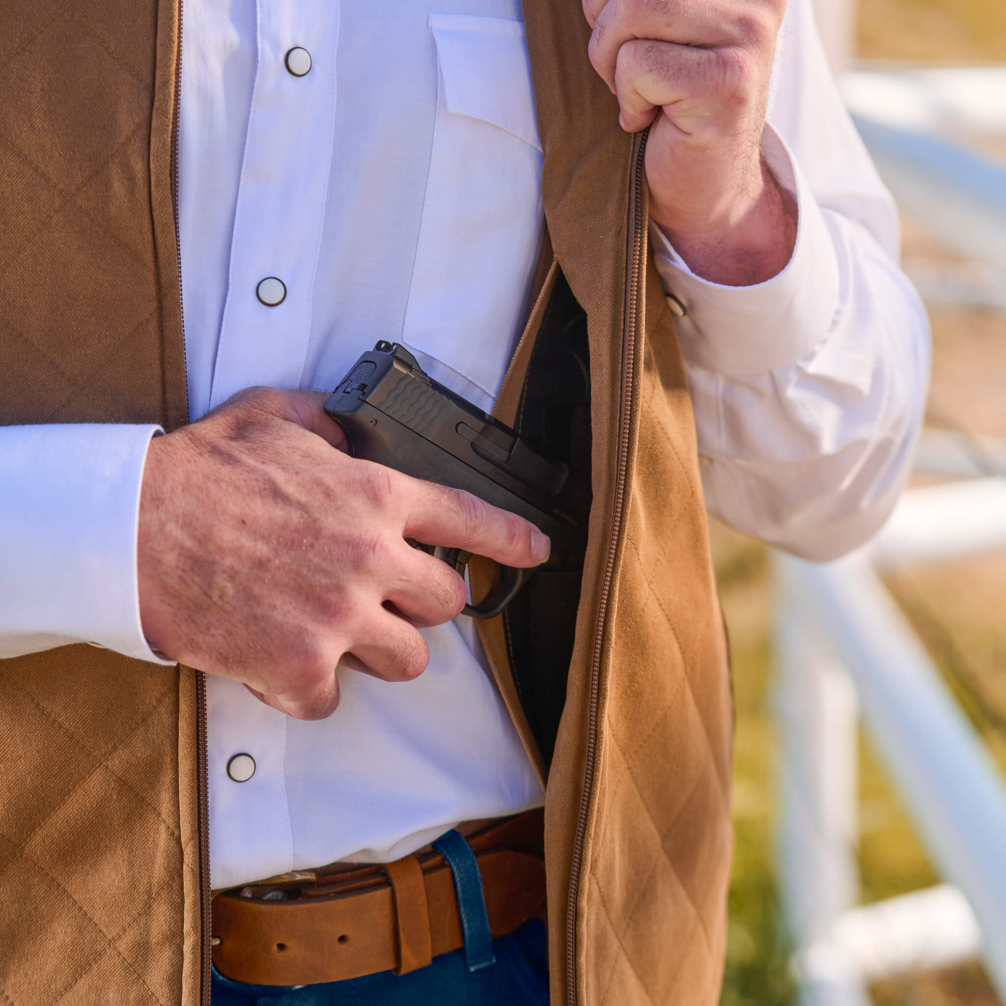 Each vest comes with 2 specifically designed interior concealed carry pockets and a removable holster. The inside lining proudly displays our 2nd Amendment flag graphic. Don't carry? The 2 interior pockets also hold a phone, wallet, passport, or any other item you might want to secure.