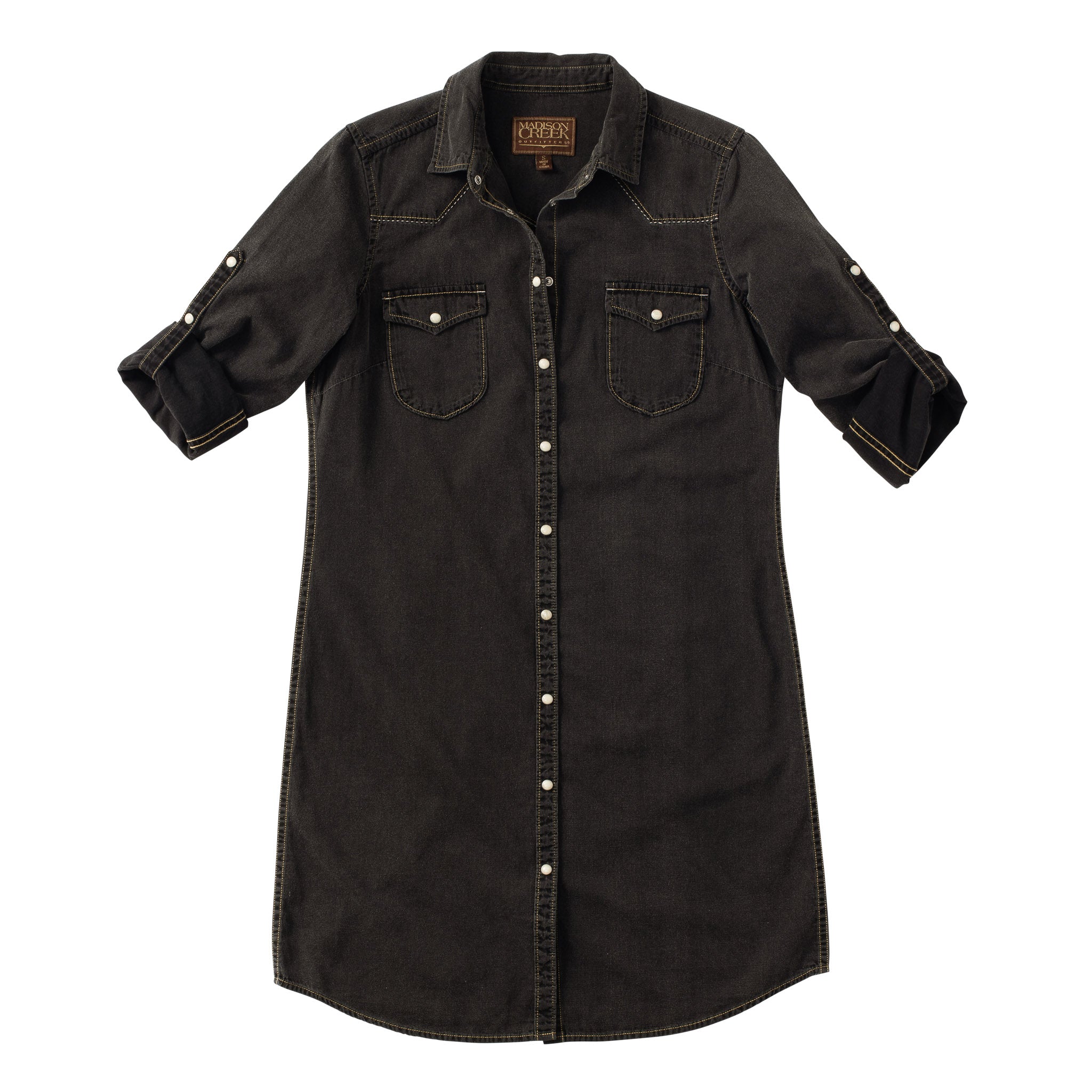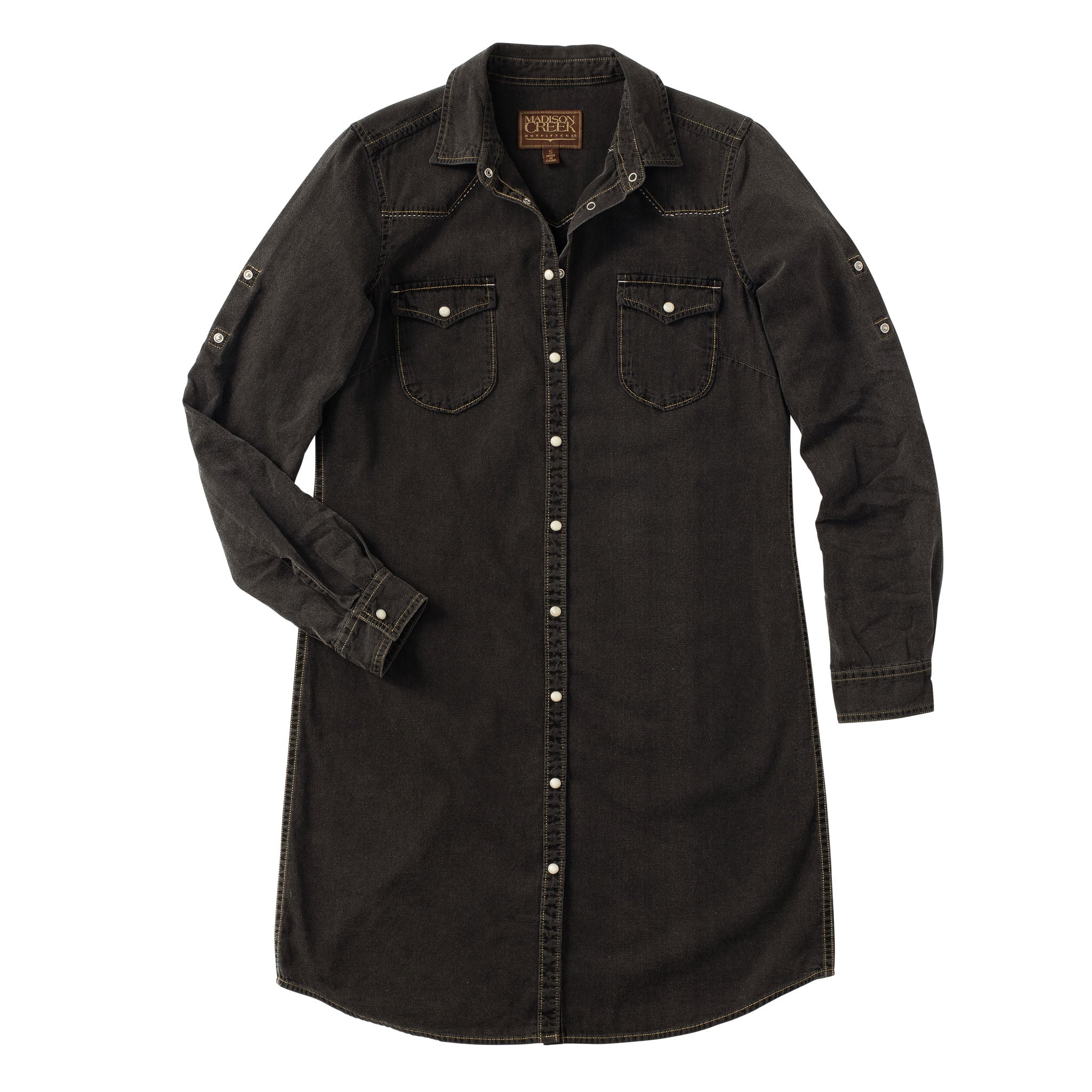 Blending timeless denim with Western-inspired details, the Savannah Denim Shirt Dress is a wardrobe essential designed for everyday wear. Crafted from soft, washed cotton denim, it features a snap-front closure, classic Western yokes, and flap chest pockets for authentic shirt-dress styling. Roll-tab sleeves let you switch between long or cuffed looks, while its versatile length pairs perfectly with boots or casual shoes.